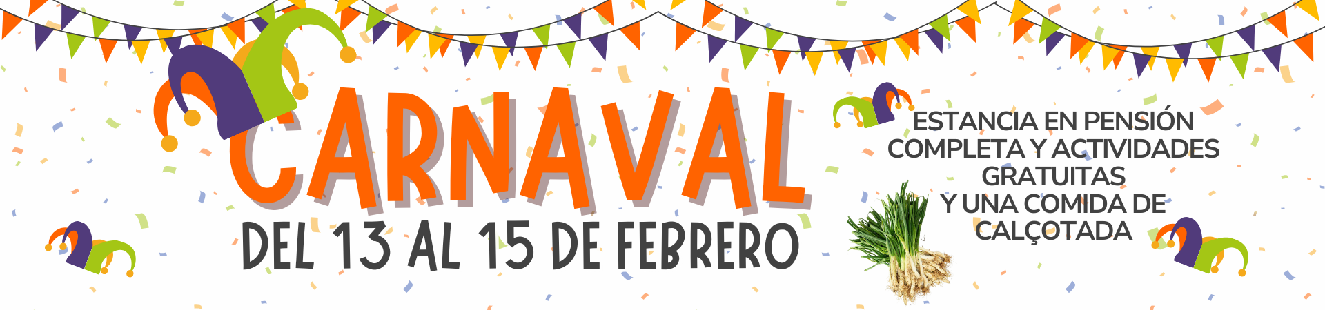 Us oferim un cap de setmana de celebració del Carnaval amb un dinar de menú de calçotada i carn a la brasa i a la nit festa de disfresses!
